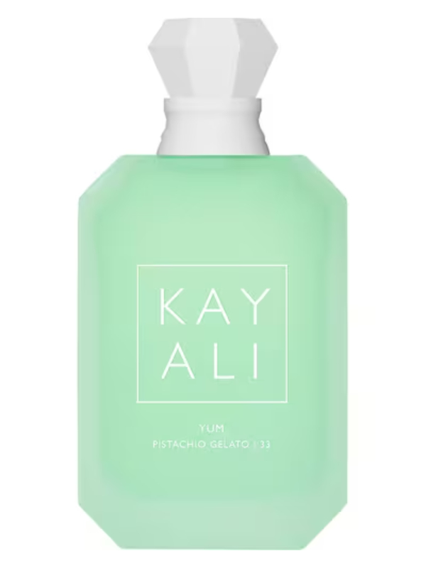 Kayali Yum Pistachio Gelato . Bursting with mouthwatering accords, this fragrance opens with notes of gourmand hazelnut and pistachio, blended with sweet rum for a tantalising first impression Yum Pistachio Gelato | 33 Eau de Parfum Intense is a delicious explosion of irresistible and edible notes including pistachio, voluptuous whipped cream, roasted hazelnut, sweet rum, fluffy marshmallow, and fizzy cotton candy.